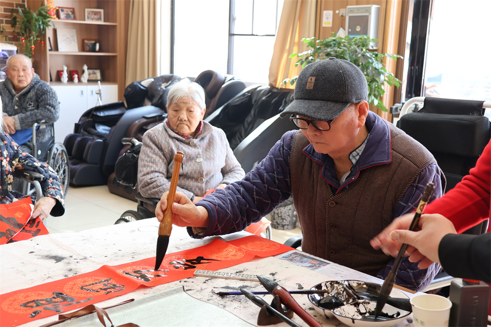 2026年1月8日,长沙沐浴在一片和煦的冬阳中。位于普亲养老·桂花坪院的活动大厅里,三张画案整齐排列,宣纸如雪,徽墨生香。